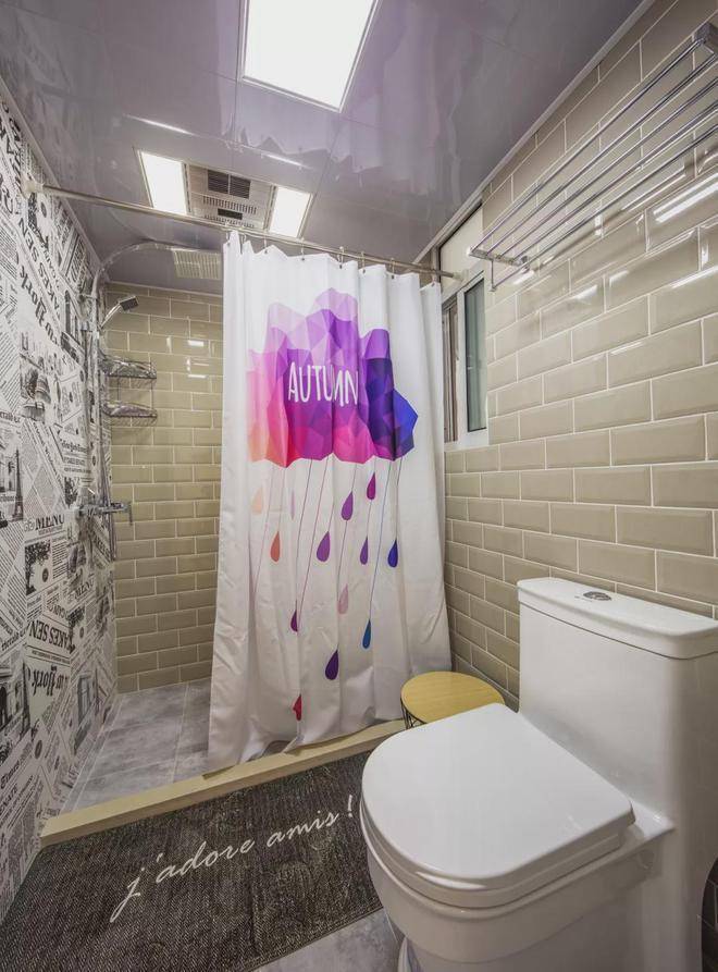 ▲卫浴区的墙面砖在暖灰色面包砖基础,安装花洒的这面墙则是以独特的报纸图案纹理的设计,淋浴区外铺上舒心的地毯全国配资最好的公司,最大化地保障居家空间的干湿分离与安全。