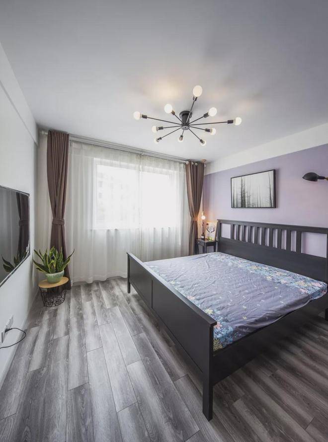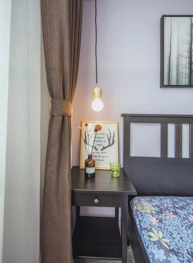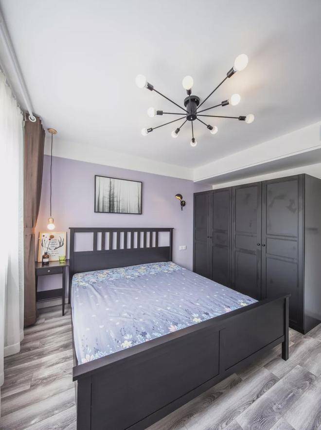▲卧室床头墙在浅紫色乳胶漆基础,挂上一副意境的森林装饰画,搭配黑色的床铺与衣柜,呈现出一个成熟端庄的氛围感。