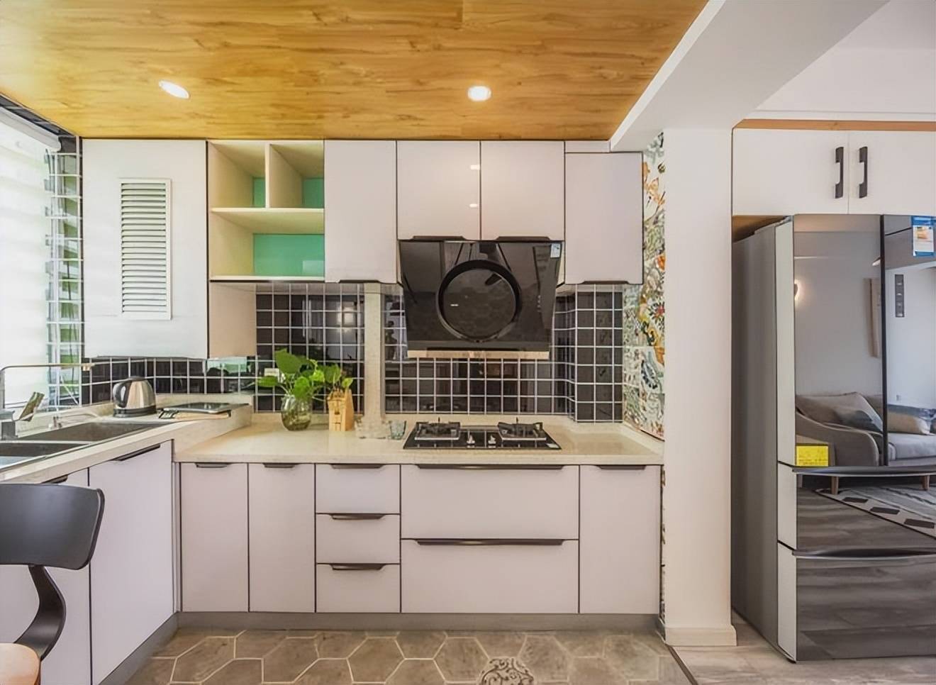▲开放式的厨房与餐厅隔着一道小吧台,暖灰色六边砖地面+黑色小格纹砖墙面,天花整体木色吊平,装入筒灯,显得简洁大方好自然。