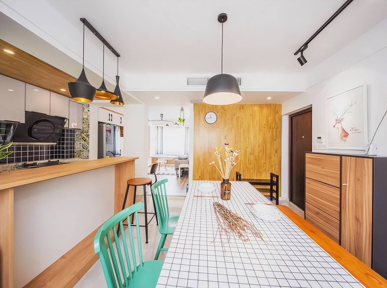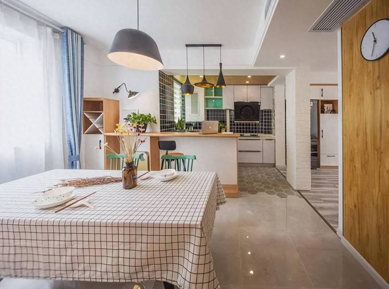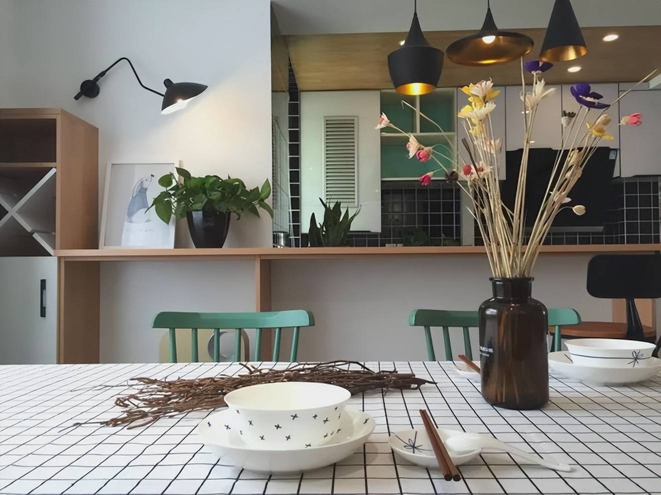 ▲餐厅的文艺餐桌搭配了两张青色温莎椅,餐桌上也是垫着格纹小桌布,整体用餐氛围显得文艺舒适。