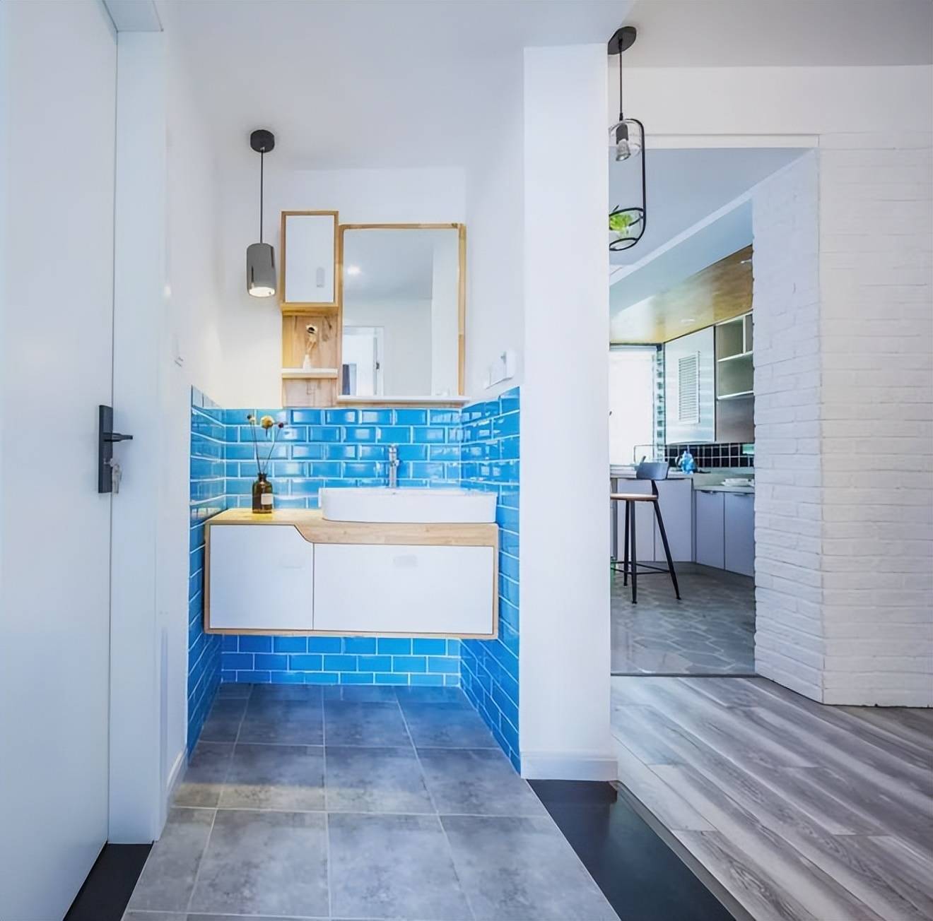 ▲洗手盆装在走廊区域,墙脚区域装着海蓝色的墙砖,壁挂洗手盆刚好嵌入中间位置,紧凑的空间也利用得舒适大气。